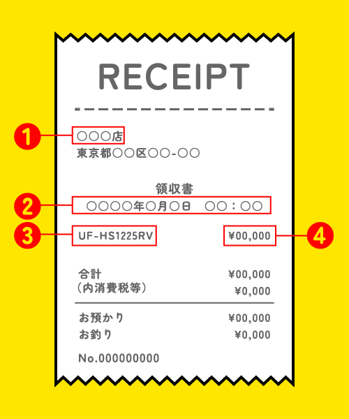 - オンラインや通信販売でご購入の場合は、購入店舗名・購入日時・購入商品名・購入金額の記載がある領収書・納品書・保証書等をご使用ください。紙の書類がない場合は、各サイトより領収書データを発行いただき、印刷して撮影してください。